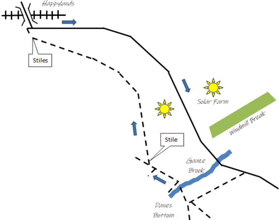 This is a longer version of Walk 1, which takes you across the Gauze Brook, over fields to the Happylands railway bridge and back along Hill Hayes Lane.