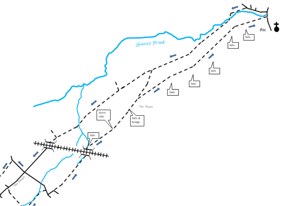 From the Radnor Arms, walk 200-300 yards towards Malmesbury, over the bridge, then turn left into Mill Lane. In another 200-300 yards you will pass some old cottages and the old mill. Soon you will see the on your left a bridleway, which you follow with the Gauze Brook first on your left and then on your right. The bridleway runs lower and parallel to the outward path.