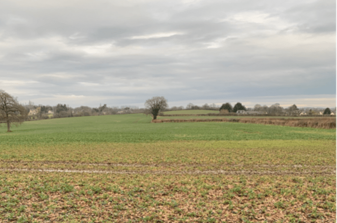 Two stiles are very evident as you cross old pastures into a larger field which you traverse bearing diagonally left to the corner to cross a stile and a footbridge into the next field. The field route now runs parallel to the A429 over The Downs, with good views of the surrounding countryside.